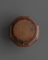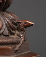 In Buddhist philosophy, the Dharma Dhatu signifies the pure nature of the mind as well as the vast domain of truth and knowledge. The Wheel of Dharma, also known as the Buddha's first teachings following enlightenment, represents the eternal cycle of life, death, and rebirth. This copper sculpture embodies the Dharma Dhatu's deep symbolism through intricate design that demonstrates both artistic mastery and spiritual reverence. The intricate patterns, embossed motifs, and harmonic balance of form represent the continuous spinning of the Wheel of Dharma, which guides practitioners on their journey to nirvana. It's more than just a decorative item; it's a potent spiritual symbol intended to promote wisdom, clarity, and inner serenity wherever it's displayed.