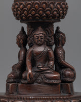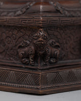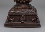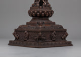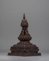 Presenting the Copper Buddha Stupa, an exquisitely created object that perfectly demonstrates the great creativity and spiritual legacy of traditional Tibetan workmanship. This magnificent stupa, crafted from oxidized copper, has detailed carvings of the Buddha on each side that stand for compassion, knowledge, and enlightenment. In Tibetan Buddhism, stupas hold great cultural and spiritual value. They are often built to honor the Buddha and contain precious relics. The exquisite craftsmanship and careful detailing perfectly capture this significance.