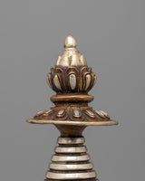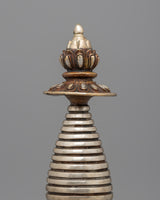 Copper Kadampa Stupa with Silver-Plated Highlights: This artwork is a stunning symbol of Buddhist spiritual significance, made with meticulous attention to detail. This stupa, 29 cm tall and 12 cm wide, weighs 1.314 kg and functions as a potent symbol of enlightenment and peace. The base has exquisite lotus petal engravings that represent purity, while the spiral dome and flame-like finial at the top symbolizes the path to enlightenment. Its exquisite combination of copper and silver plating creates a traditional, antique finish, making it a one-of-a-kind complement to any spiritual or meditation environment.