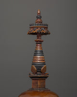 A parasol sits atop the stupa, symbolizing protection and shelter. Under it, spiral carvings show the journey to enlightenment, with each step representing a stage of spiritual development. The harmika is located below these sculptures and is embellished with eye carvings, followed by depictions of Buddhas in the four directions. Below the Buddha carvings is a double-petaled lotus carving with the head of an animal resembling a snake or turtle, representing wisdom and metamorphosis. The base is further embellished with delicate floral carvings, which add to the aesthetic and spiritual appeal.