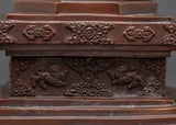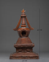 This Handcrafted Buddhist Oxidized Copper stupa, crafted from oxidized copper, represents enlightenment, tranquility, and spiritual awakening. Expertly crafted by Himalayan artisans, this piece highlights traditional Tibetan patterns and features a beautifully detailed design. This spiritual monument, which stands 47 cm tall and 27 cm wide, is a striking and solemn focal point for any altar, meditation space, or private sanctuary. The stupa is a potent spiritual tool and ornament because of its classic shape, which symbolizes the Buddha's enlightened mind and the journey toward enlightenment.