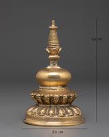 Experience the spiritual energy of the Handcrafted Himalayan Buddhist Stupa, a stunning brass sculpture that brings tranquility and harmony to your space. Standing 14 cm tall and weighing 0.61 kg, this meticulously carved Buddhist Stupa signifies the path to enlightenment and the balance between the physical and spiritual realms. The Stupa's design incorporates ancient Tibetan motifs rich in meaning, reflecting the Buddha's teachings and enhancing your meditation or prayer practice. The brass material emits a warm, inviting glow that adds a holy vibe to your house or meditation space.