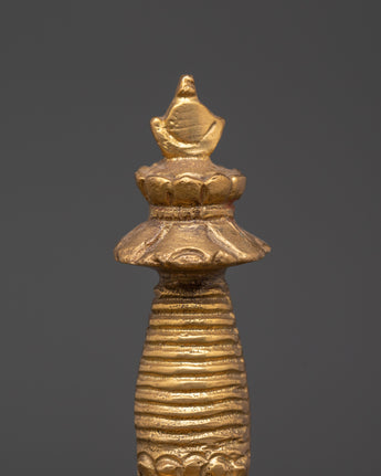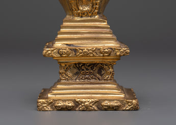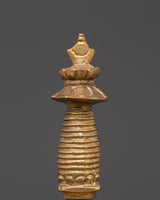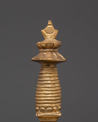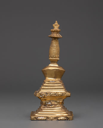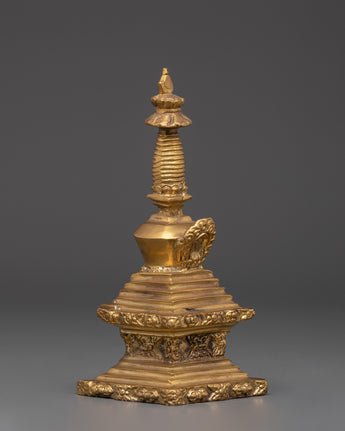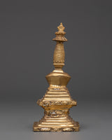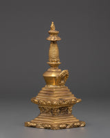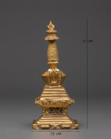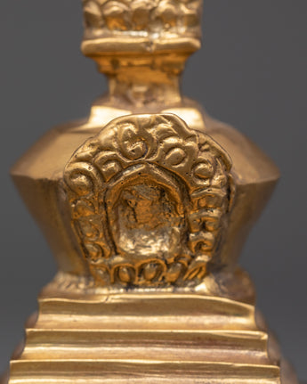 The stupa's design combines ancient Buddhist symbols with significant spiritual significance. A lotus bud at the top represents purity and spiritual growth, while the Buddha's teachings are described at the base and columns. Every detail of this relic has been carefully made, contributing to the serene vibe it exudes in your surroundings. Whether displayed on your altar or as a decorative element in your house, this stupa is a powerful symbol of enlightenment and guidance for your spiritual journey.