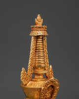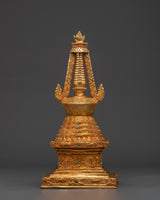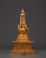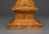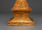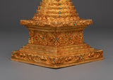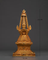 Each layer of this stupa is exquisitely crafted, with brilliant coral and blue stones accentuating its beauty and spiritual importance. The copper body symbolizes strength and stability, whilst the gold coating indicates purity, knowledge, and spiritual riches. Placing this stupa in your house or temple not only brings good energy and benefits, but it also serves as a visual reminder of the Buddha's teachings and the road to enlightenment. This item is an excellent gift or centerpiece for your spiritual décor.