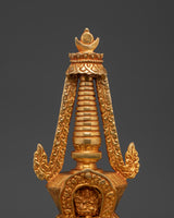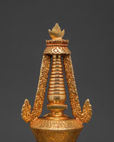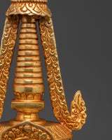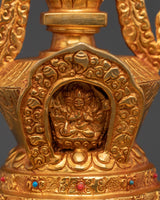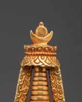 Embrace the spiritual energy of this Handmade Spiritual Shrine Stupa, carefully created from copper and embellished with bright faux stones. This stupa, which stands 29cm tall and 15cm wide, is carefully gold-plated, reflecting heavenly light and boosting any space's spiritual aura. Stupas are traditionally used as potent symbols of enlightenment, tranquility, and protection, making them ideal for home altars, meditation nooks, and spiritual practice centers.