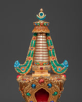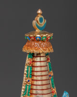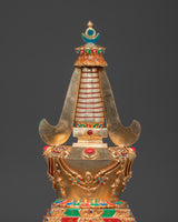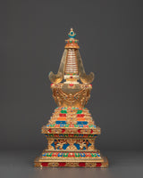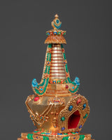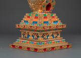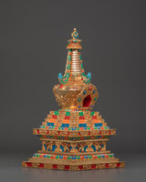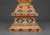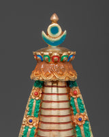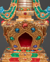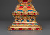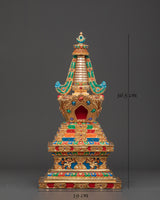 Gold plating lends the stupa a rich, celestial appearance, while turquoise, coral, and lapis lazuli stones add color and spiritual significance. Coral represents life and protection, turquoise protects, and lapis lazuli is valued for its spiritual insight. This stupa embodies the rich heritage of Himalayan Buddhism, making it a valuable addition to any spiritual space, whether for meditation, prayer, or contemplation.