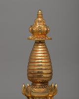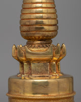 The stupa (chorten in Tibetan tradition) is a spiritual building that symbolizes the Buddha's enlightened intellect. It is used for devotional offerings, meditation, and rituals and represents spiritual freedom and the balance of universal forces. Keeping a Himalayan stupa in a sacred location purifies karma, brings good energy, and improves consciousness. This gold-plated Buddhist stupa is ideal for home shrines, monasteries, and holy areas.