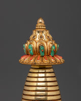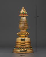 The Nepalese Copper Stupa is a powerful spiritual emblem that represents the Buddha's enlightened intellect. This handcrafted stupa measures 30 cm in height and weighs 1.63 kg. It is meticulously fashioned in traditional Himalayan style. The construction is gold-plated for a brilliant finish. It features exquisite inlays of artificial turquoise and coral stones, both of which hold significant meaning in Tibetan and Nepalese Buddhist traditions. This stupa is ideal for adding a hallowed presence to your meditation altar, shrine, or spiritual space, exuding calm and enlightenment.