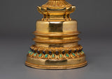 Skilled Nepalese artisans crafted this piece from copper and then gold-plated it to add brilliance and spiritual resonance. The stupa, commonly regarded as a sacred structure, serves as both a vessel for relics and a representation of the Buddha's enlightened mind. The base is embellished with a lotus design and faux gemstones, combining ancient symbolism with artisan skill. Utilize this Tibetan Buddhist decor to purify your space, deepen your practice, and attract abundant spiritual energy into your home. Whether you're a practitioner or a collector, this handmade stupa is a powerful expression of devotion and dharma.