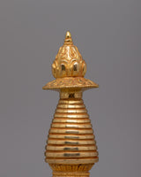This stunning 24K gold-plated stupa, with a solid copper body, is a powerful symbol of enlightenment and peace in Buddhist tradition. Standing 19 cm tall and 8 cm wide, the stupa represents the five elements of Buddhist cosmology: earth, water, fire, air, and space. Each tiered layer represents one of these components, combining physical existence with spiritual transcendence, while the foundation grounds the stupa in the earth element, representing the grounded start of spiritual development. The stupa's elongated dome, which represents the Buddha's knowledge and compassion, encourages meditative reflection.