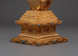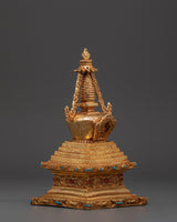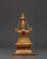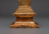 Tibetan Stupa Altar Statue | Gold-Plated Chorten with Coral & Turquoise Stone Inlay