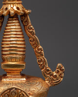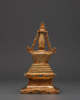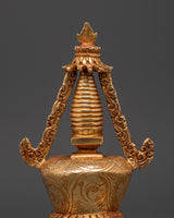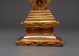 Bring divine energy into your spiritual environment with this Tibetan Stupa Altar Statue, a symbol of Enlightenmentnt and protection in Tibetan Buddhis This handcrafted stupa, measuring 22 cm in height and 12 cm in breadth, and weighing 1.13 kg, serves as a significant centerpiece for your home altar, meditation area, or temple environmen The structure features a copper body, adorned with gold plating tothat reflectshe radiance of spiritual radiance.