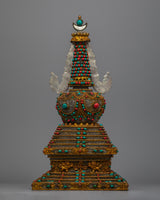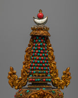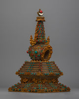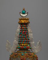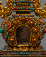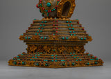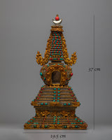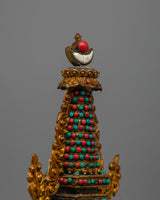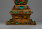 Presenting the Tibetan Stupa Chorten, an exquisitely designed artifact that perfectly captures the spiritual legacy and extraordinary creativity of Tibetan arts and crafts. This gorgeous stupa is further enhanced with artificial Turquoise and Coral, adding to its visual appeal and spiritual importance. Its high-quality Copper body is embellished with electro Gold Plating . This chorten, which weighs 2.04 kg and measures 37 cm in height by 19.5 cm in width, is a magnificent depiction of Buddhist teachings and a symbol of enlightenment.