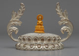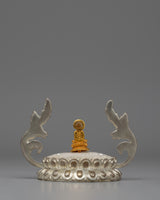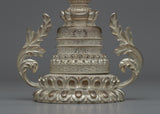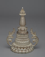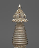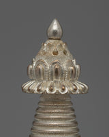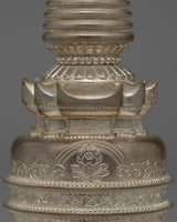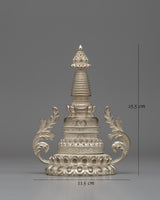 The Traditional Buddhist Stupa is a magnificent work of art that was skillfully crafted from a copper body and exquisitely electroplated in silver. This stupa, which is 15.5 cm tall and 0.49 kg in weight, has elaborate carvings that exhibit remarkable skill and attention to detail. In addition to enhancing its aesthetic appeal, its bright silver finish has spiritual meaning and represents purity in the Buddhist faith.