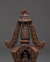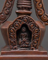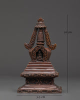 Stupas are highly venerated symbols in Buddhism, reflecting the Buddha's enlightened mind and functioning as memorials of peace, harmony, and the path to enlightenment. This beautifully crafted stupa features a central chamber with a Buddha figure, reminiscent of the traditional practice of storing treasures and sacred writings. The tiered design and symbolic parasol provide blessings, protection, and spiritual merit to your house. The corroded copper body not only assures endurance but also exudes depth and reverence, making this relic appropriate for both everyday meditation and ceremonial use.