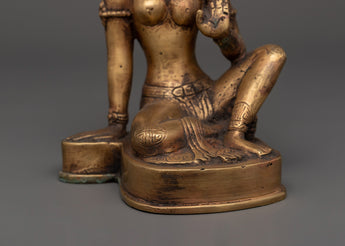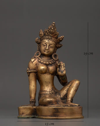 This wonderfully Handcrafted Brass Parvati Statue is in Varada Mudra. Goddess Parvati is elegantly seated, executing the Varada Mudra, a symbolic gesture of bestowing boons and blessings on all seeking her heavenly grace. The gesture expresses her sympathetic character and willingness to provide protection, support, and fulfillment of desires. Her serene expression, along with her stately posture, exudes tranquility and unconditional love. She exudes grace and strength by wearing a majestic crown, two delicate earrings, and a finely designed necklace. This magnificent statue measures 19 cm in height and 13 cm in breadth, making it a bold but elegant addition to your sacred home altar, meditation room, or spiritual collection.