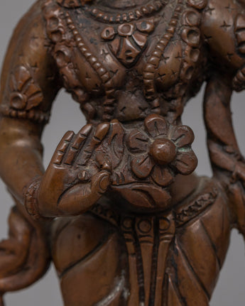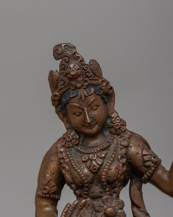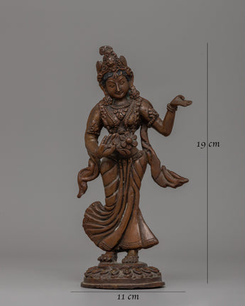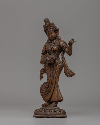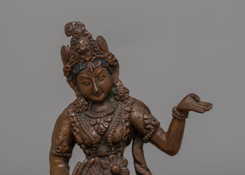 Oxidized Copper Standing Tara is the Hindu goddess of love, power, and devotion. She is Lord Shiva's partner and the divine mother of the universe. She embodies Shakti's energy, the feminine element that guides creation and balance. This oxidized copper Standing Parvati Statue, measuring 19 cm in height and 11 cm in width, is a stunning depiction of elegance and strength, making it a great centerpiece for an altar, home decor, or meditation room.