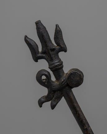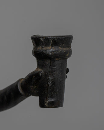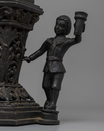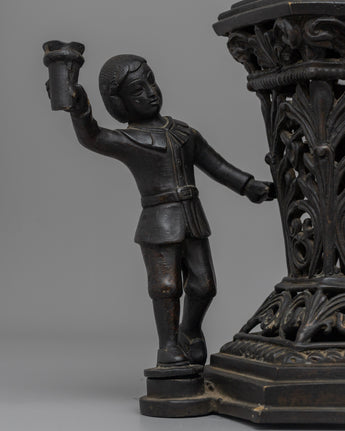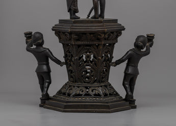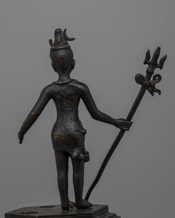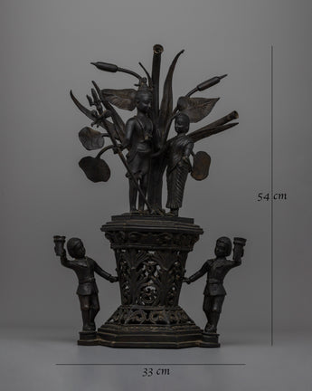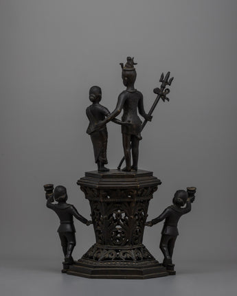 This stunning Shiva and Parvati statue, made of Oxidized Brass, beautifully depicts the holy pair in a timeless moment of spiritual peace. Lord Shiva, standing on a flower vase with his formidable Trishul dagger, emits strength and protection, while Goddess Parvati stands by his side, representing elegance and caring energies. The diligent intricacy of their bodies is enhanced by the representation of two devoted disciples—a male and a female—standing at the bottom, symbolizing the universal balance of masculine and feminine energy. Every inch of this sculpture reveals profound spiritual symbolism and expert craftsmanship.