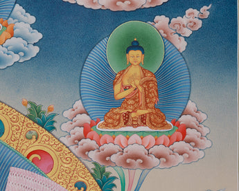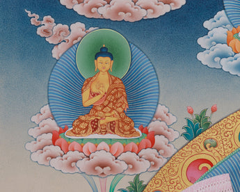 The 1000-Armed Chenrezig Bodhisattva Canvas Print portrays Chenrezig standing on a lotus seat, representing purity and enlightenment. Above him are depicted Buddhas from the past, present, and future, representing Buddhism's eternal wisdom. The revered Guru Rinpoche (Padmasambhava) is shown below alongside other Buddhist masters to emphasize the ongoing transmission of Buddhist teachings. This arrangement connects Chenrezig's compassion to Buddhism's fundamental teachings, demonstrating the interplay between divine compassion and the guidance of enlightened masters.