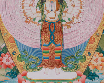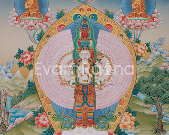 The 1000-Armed Chenrezig Bodhisattva Canvas Print is a stunning depiction of the Bodhisattva of Compassion, rendered in beautiful detail on high-quality Giclee cotton canvas. This artwork depicts Chenrezig in his 1000-armed form, with each hand representing a different aspect of compassion and an eye in each palm, symbolizing the Bodhisattva's all-seeing nature and limitless ability to perceive suffering and respond with mercy.