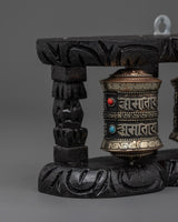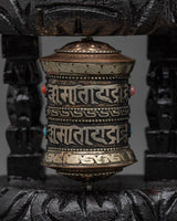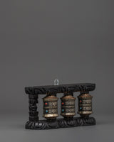 Each wheel is fixed on a dark wooden frame, enhancing the overall authenticity and natural charm. The exquisite inscriptions are gracefully complemented by subtle accents, which symbolize prayers for compassion, knowledge, and peace. It is believed that turning the wheels produces the same benefits as chanting the mantra, bringing optimism and spiritual protection to any space.
