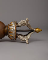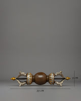 This Vajra has a detailed design, measuring 9 cm in height by 39 cm in width and weighing 1.91 kg, making it an excellent ornamental element for altars, meditation rooms, or cultural shows. The silver-plated ornaments stand out against the oxidized copper, highlighting its fine workmanship and metaphorical depth. In the Buddhist tradition, the Vajra represents indestructibility and steadfast spiritual determination, and it is frequently utilized in rituals to request divine protection and knowledge. The five prongs represent the triumph of enlightenment over ignorance, emphasizing its significance as a holy emblem in Tibetan Buddhism.