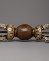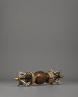 The Handmade 5-pronged Tibetan Vajra is a finely constructed Buddhist ceremonial relic with deep spiritual significance. This Vajra, made of oxidized copper with silver-plated highlights, exemplifies traditional Tibetan artisans' exceptional talent. The five-pronged pattern at either end signifies the five transcendental Buddhas, which represent the transformation of negative emotions into wisdom. A smooth, rounded sphere in the middle of the Vajra represents the union of wisdom and technique, a key principle in Vajrayana Buddhism. The oxidized copper body gives the Vajra an ancient, aged appearance, adding to its aesthetic and symbolic importance as a sacred object in Buddhist ceremonies and ornamental collections.