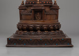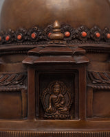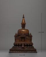 Enhance your spiritual practice with this stunning Copper Stupa, a Sacred Buddhist Stupa for Meditation and Spiritual Elevation. Handcrafted with a two-color oxidized finish, this gorgeous sculpture stands 31.5cm tall and 22.5cm broad, making it an eye-catching centerpiece for any meditation room or shrine. The stupa's elaborate craftsmanship represents the five elements and the route to spiritual awakening, which is a powerful symbol in Buddhist tradition.