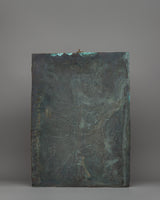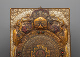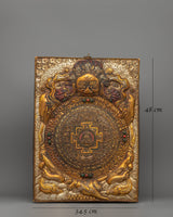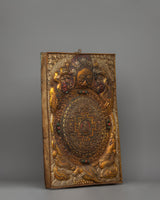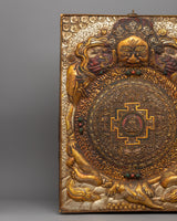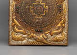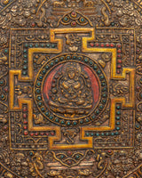 Our Amitabha Buddha Mandala Wall Hanging, 48cm tall and 34.5cm wide, is beautifully created from copper, gold, and silver-plated materials. This sacred mandala sculpture weighs 2.05kg and depicts the central Amitabha Buddha, who is revered in Mahayana Buddhism for his limitless compassion and wisdom. The mandala design, with its intricate patterns and deep symbolism, reflects the universe as well as the cycle of life and death, and it can be used to guide meditation and spiritual progress.