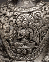 The Amitabha Copper Silver Plated Statue is a stunning handcrafted Tibetan Buddhist sculpture representing the powerful symbols of longevity and compassion. This sacred statue, 14.5cm tall and 10cm wide, depicts Amitabha in a quiet contemplative pose, radiating serenity and tranquillity. It is expertly fashioned from copper and silver plated for a gorgeous finish and is an excellent addition to any house, altar, or meditation place. This spiritual healing décor encourages attention and spiritual growth while also fostering the characteristics of knowledge, compassion, and love.