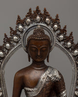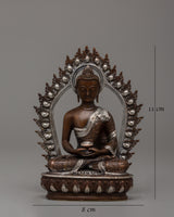 The Amitabha Dhyani Buddha Statue is a beautifully crafted piece of copper with a silver-polished finish. It stands 11 cm tall and 8 cm wide, and weighs only 0.21 kg, making it ideal for displaying in personal spaces or meditation areas.