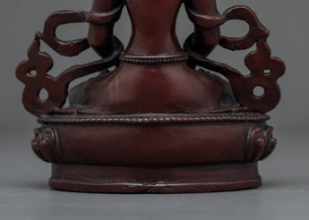 Introducing Amitayus, a small, handmade, oxidized figure crafted by hand in Patan, Nepal. Crafted from oxidized copper, this piece is a perfect example of Nepalese metalworking. The god of longevity and knowledge, Amitayus, is shown with fine details, an enduring oxidized finish, and a calm, contemplative stance.