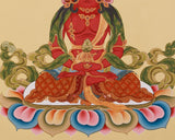 In the background, a halo surrounds his head, signifying his enlightened state and spiritual radiance. The thangka features a serene yellow background, symbolizing wisdom and spiritual enlightenment, closely associated with Amitayus Buddha. The color symbolizes calmness and unity with nature and is revered for its ability to grant longevity and compassion to those seeking its blessings. It is an excellent addition to meditation rooms, altars, or sacred spaces and serves as a reminder of infinite life and wisdom.