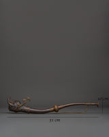 With this Antique-Finish Brass Kangling, a sacred trumpet used in profound tantric practices like Chöd, you can embrace the potent resonance of Tibetan ritual. This ceremonial horn, measuring 51 cm in length and featuring an antique finish, is used in profound spiritual ceremonies to summon protective deities and symbolize the severing of individuality. The handcrafted service, featuring an opening and dragon-head base, contributes to its magical and artistic appeal.
