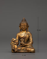 This Antique Finish Medicine Buddha Statue, expertly carved from a copper body and plated in gold, will assist you in invoking the power of healing and spiritual well-being. The Medicine Buddha is depicted sitting in calm meditation with a healing bowl and a blooming myrobalan plant—symbols of divine health and vitality—held in this small but potent figure, which measures 8 cm in height by 6 cm in width.