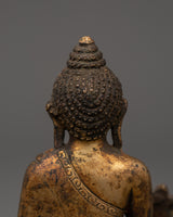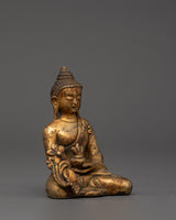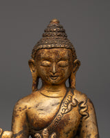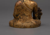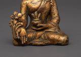 A beautiful spiritual artifact ideal for individual altars, meditation areas, or as a warm present, this gold-plated copper statue is not simply a revered depiction of the Healing Buddha. The ageless touch of the antique finish increases its historical and spiritual appeal. In Tibetan and Mahayana traditions, the Medicine Buddha, also called Bhaisajyaguru, is regarded as the ultimate healer who can physically and spiritually restore all beings.