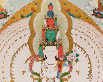 Chenrezig, one of the most popular Bodhisattavs, is also popularly known as Avalokitesvara. In Vajrayana Buddhism, Chenrezig means gazing with the eyes of compassion in Tibetan words. Avalokitesvara Thangka is used to do visual meditation practice to develop a calm, kind, and compassionate heart.