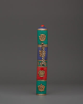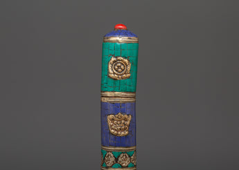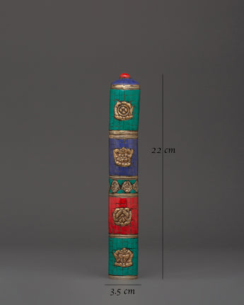 Enhance meditation and spiritual activities with our Auspicious Symbol Incense Holder - Handcrafted Tibetan Brass Burner. This incense holder, made of brass with copper accents, is artistically fashioned with auspicious symbols representing blessings, protection, and spiritual harmony. The colorful artificial stones of coral and turquoise lend a sense of traditional Himalayan style. This incense holder is stylish and useful, measuring 22cm high and 3.5cm wide and weighing 0.16 kilogram. It emits peaceful scents and represents good fortune and positive energy, making it ideal for meditation, yoga, spiritual ceremonies, and mindfulness practices. Its small size and intricate craftsmanship make it a perfect complement to any altar, yoga area, or home decor collection.