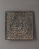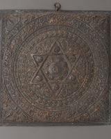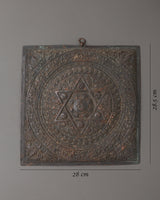 This handcrafted auspicious wall hanging made of pure copper is a potent sign of protection, prosperity, and spiritual balance. It stands 28.5cm tall and 28cm wide and features elaborate religious themes and divine symbols commonly employed in Hindu and Buddhist cultures to bring positive energy, blessings, and harmony into any place. Whether displayed in a home, temple, meditation room, or altar, this item adds to its surroundings' spiritual aura and visual appeal.