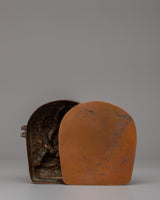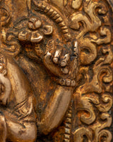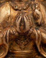 This Ghau box's elaborate design depicts Avalokiteshvara seated in a meditative posture, holding sacred symbols with four arms. In Buddhism, each posture and hand gesture, or mudra, has a deep spiritual meaning. The central hands in prayer signify universal compassion, while the other hands hold a lotus and other sacred artifacts, representing purity and the way to enlightenment. The intricate carvings and gold gilding heighten its holiness, evoking serenity and devotion. This Avalokiteshvara Ghau box is a true emblem of Buddhist teachings and spiritual peace, making it ideal for meditation or display purposes.