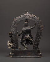 Banglamukhi, one of the Mahavidyas, stands in a dynamic position. She carries a club (danda) in her raised right hand, suggesting her ability to defeat foes, while her left hand pulls a demon's tongue, indicating control over bad speech and actions. The statue, adorned with elaborate jewelry and flanked by a fiery arch, embodies her protective and transformational power, making her a powerful symbol of victory and overcoming obstacles.