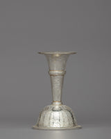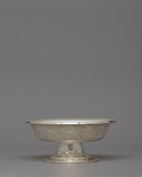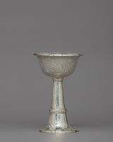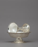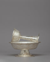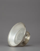 This Beautifully Handcrafted Serkyem Set, comprised of 22 tolas (about 256 grams) of pure silver, is a sacred item used in Tibetan Buddhist ceremonies. This set, 13.5 cm tall and 13 cm broad, is usually used in pujas to offer liquids such as tea or water to deities, representing wealth, appreciation, and devotion. The exquisite engravings and polished silver finish provide elegance and purity to the design.