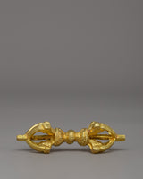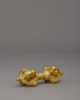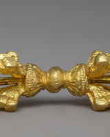 This Bell & Vajra for altar set is designed to create a spiritual atmosphere during Buddhist rituals. The bell, 14.5 cm high and 7.5 cm wide, weighs 0.258 kg. Made of durable brass, it produces a pure, resonating sound ideal for invoking blessings and focusing the mind during meditation or prayer. The vajra weighs 0.044 kg and measures 2 cm in height by 8 cm in width. It is meticulously crafted from a combination of brass and bronze, representing the indestructibility of truth and compassion.
