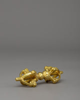 This beautifully crafted bell and vajra ritual set is essential in Buddhist rituals. The bell weighs 0.174 kg and measures 11.5 cm in height by 6 cm in width. It is expertly crafted from brass and has a polished finish that adds to its elegance. The vajra, a symbolic ritual object representing the unshakeable nature of truth, is 2.2 cm tall and 8 cm wide, weighing 0.044 kg. This set, made of brass and bronze, combines functionality with spiritual significance.