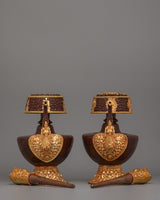 Each Bhumba stands 33 cm tall and 21 cm wide, making it substantial in size and presence. The ornate golden crown represents divinity and reverence, while the delicate gold plating contrasts beautifully with the oxidized copper base, creating a visually striking effect. More than just a decorative piece, the Bhumba Set holds profound spiritual importance, symbolizing the sacred nature of offerings in shrines and ceremonies. Its elegant craftsmanship and symbolic meaning make it a treasured item for spiritual and ceremonial use.