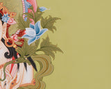 In Tibetan Buddhism, Sita Tara, also known as White Tara, is one of the most revered female deities. The Bodhisattva of Compassion, Avalokiteshvara, is said to have created her from his tears as a manifestation of his pure, nurturing love. White Tara represents longevity, healing, and maternal compassion, whereas Green Tara represents swift action. She is seated in vajra posture in this thangka, with her left hand holding a blossoming utpala lotus, which represents wisdom and purity, and her right hand making the offering gesture (Varada Mudra). Her iconic seven eyes, which are situated on her forehead, hands, and soles, symbolize her capacity to see the suffering of beings in all worlds and react to it with everlasting compassion. This thangka is both a sacred work of art and a spiritual support, ideal for spaces of meditation, healing, and devotion.