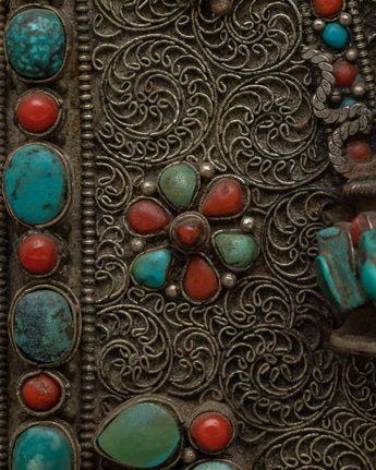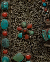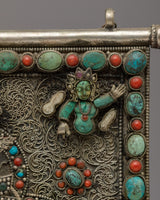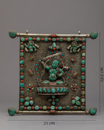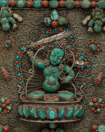 Introducing our captivating Manjushri Boho Wall Art, expertly handcrafted on a copper body and elegantly adorned with silver plating. This stunning piece of art showcases the wisdom and grace of Manjushri, the Bodhisattva of Wisdom. Embedded gemstones further enhance the intricate details and add a touch of brilliance to the artwork. The combination of the copper body, silver plating, and gemstones creates a mesmerizing visual display that is sure to become the focal point of any space. Embrace the divine energy and aesthetic beauty of the Manjushri Boho Wall Art and elevate your home or office decor to new heights.