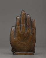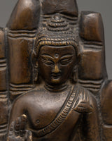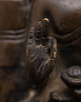 This sculpture is skilfully cast in a metal body with a gorgeous brass finish, reflecting complex craftsmanship influenced by Himalayan creative traditions. Its highly crafted lotus foundation and styled backdrop enhance the sculpture's depth and spiritual strength. This Amogasiddhi Buddha statue, ideal for meditators, Buddhists, or anybody interested in inner transformation, is more than just decoration; it's a potent spiritual tool that promotes clarity, strength, and transcendence.