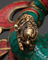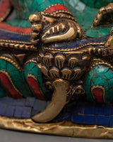 This stunning Brass Dzambhala Statue with Coral, which is handcrafted from brass and embellished with colorful Artificial coral and turquoise inlays, is a great way to invoke plenty and spiritual richness. At 21.5cm in height and 2.75kg in weight, this magnificent depiction of the Tibetan God of Wealth radiates loving giving and heavenly authority. Dzambhala is a strong protector who bestows wealth, good fortune, and spiritual depth to his devotees in all Himalayan Buddhist traditions.