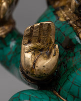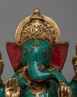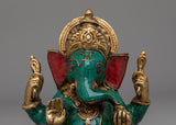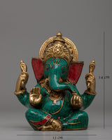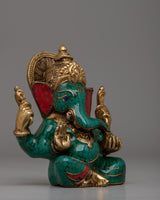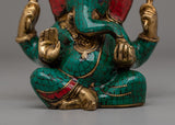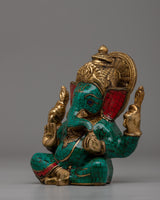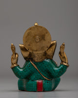 Brass Ganesha Statue with Turquoise & Coral Inlay | Spiritual Harmony